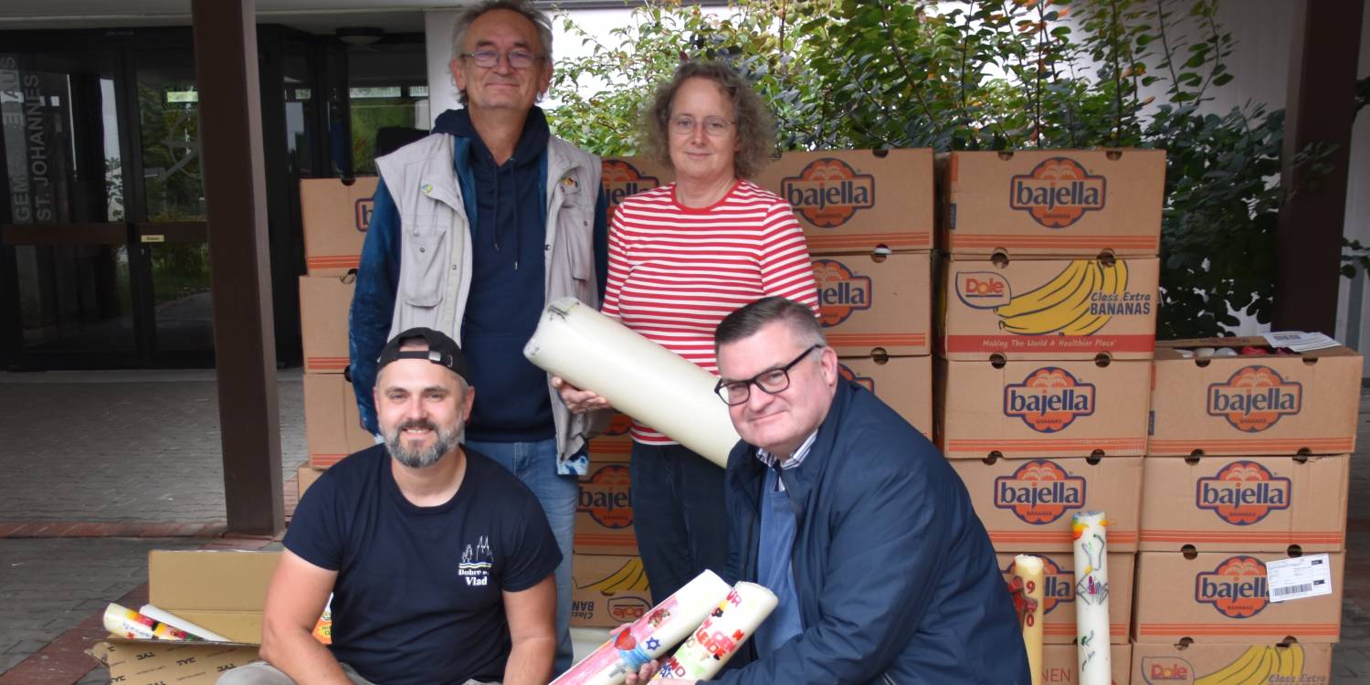 Anfang Oktober konnten nun über 600 kg Kerzen und Wachsreste in 31 Bananenkisten an den Vorsitzenden von Dobre e. V. Ukraine Hilfe im Rheinland Ralf Link und sein Team übergeben werden. Zusätzlich wurden noch über 800 kg aus Trochtelfingen in die Gemeinde St. Johannes gebracht, so dass sich die Anfahrt aus Köln doppelt gelohnt hat.