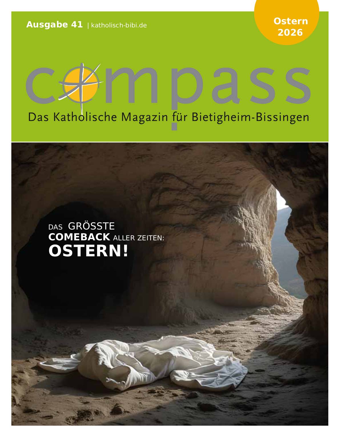 Dreimal im Jahr erhalten alle katholischen Haushalte in Bietigheim-Bissingen unser Gemeindemagazin „compass“. Zu Ostern, nach den Sommerferien zu Erntedank und zu Weihnachten findet sich eine Ausgabe in den jeweiligen Briefkästen der Gemeindemitglieder.