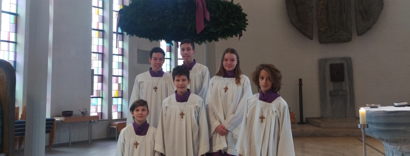 Mit dem Beginn der Adventszeit am 1. Advent hat sich auch die liturgische Farbe im Gottesdienst geändert. Bis Weihnachten tragen Priester und Ministrantinnen und Ministranten violette Gewänder, weil die Adventszeit auch eine Besinnungs- und Bußzeit vor dem großen Fest Weihnachten/Geburt des Herrn ist. Die traditionelle Farbe, die sich auch in der sechswöchigen Fastenzeit vor Ostern wiederfindet, ist dafür die Farbe Lila oder Violett. Die Minis in der St. Laurentius-Gemeinde haben in diesem Jahr neue Gewänder in den liturgischen Farben Lila und Grün bekommen, und am 1. Adventssonntag wurden die violetten Gewänder erstmals getragen. Auch der Adventskranz in der Kirche ist mit lila Kerzen und Schleifen geschmückt.