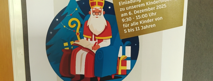 Am kommenden Samstag, den 06.12.2025, findet der Kinderbibeltag in der Sankt Laurentius Kirche von 09:30 Uhr – 15:00 Uhr für alle Kinder von 5 – 11 Jahren statt. Im Mittelpunkt dieses Kinderbibeltages steht der Nikolaus. Gegen 14:30 Uhr werden die Kinder auch die Möglichkeit haben, den Nikolaus persönlich zu treffen. Für ein gemeinsames Mittagessen wird gesorgt.