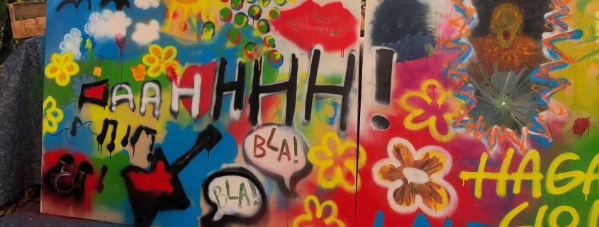 Die Künstlerin Marliina – die von sich selbst sagt, eine Synästhesistin zu sein – konnte man auch schon am Vormittag in einem Workshop erleben. Menschen unterschiedlichen Alters versuchten sich in Acryl- und Graffiti- Technik und erstellten so gemeinsam großformatige Bilder zu „Hagan lio – seid laut“, die am Abend auch zu besichtigen waren. Wer wollte, konnte sich also an diesem Tag mit vielen Sinnen berühren lassen.